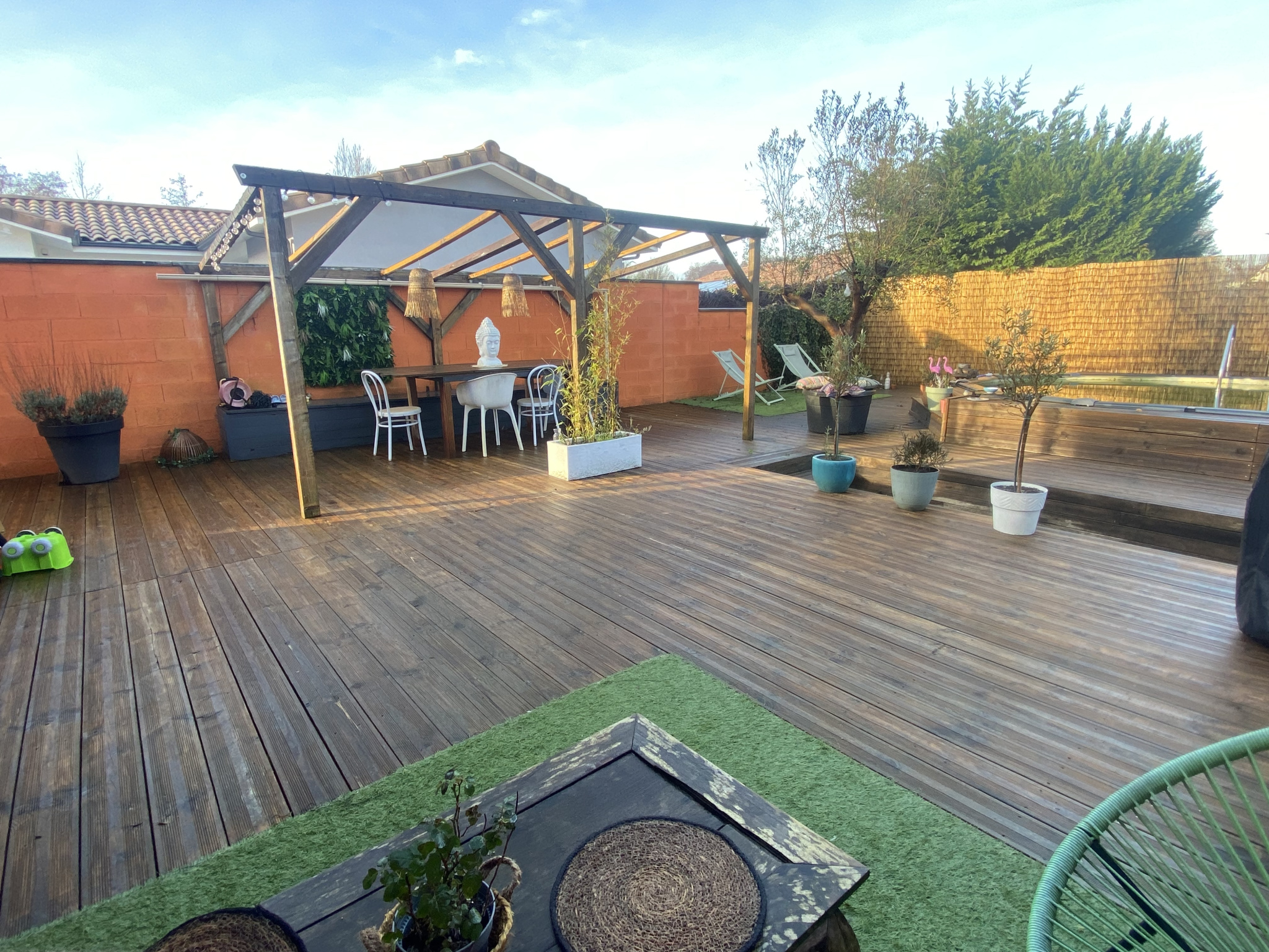Dans le jardin de 620m2, vous pourrez profiter d'une grande terrasse bois et sa pergola couverte, bronzer autour de la piscine ou jouer à la pétanque sur le terrain attenant.