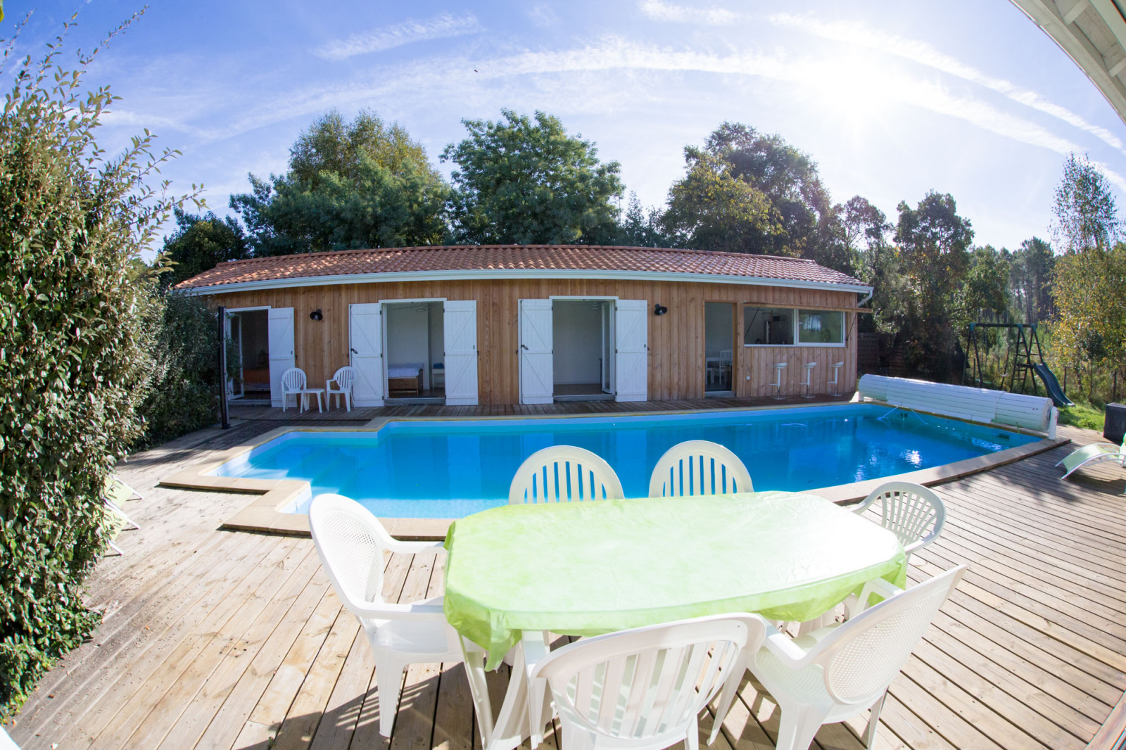 La piscine chauffée qui se situe entre les deux maisons est entourée de grandes terrasses.